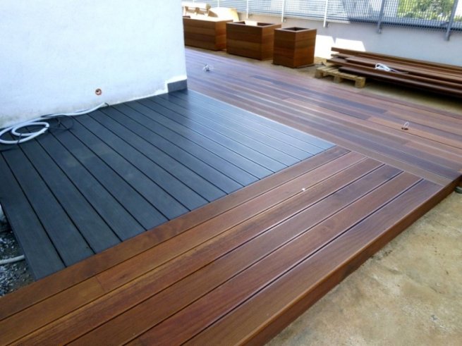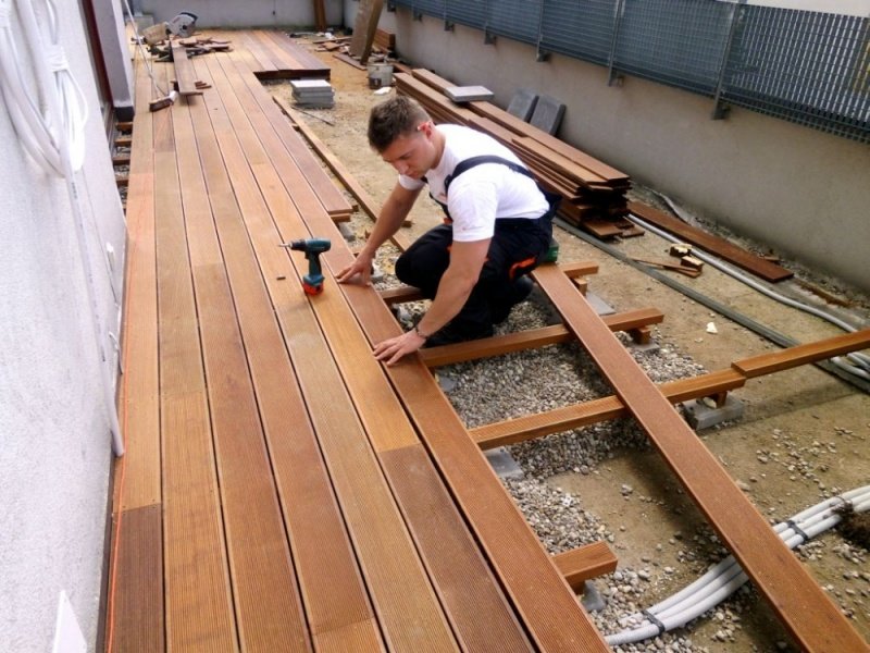 Do wypoziomowanych i przykręconych legarów mocujemy deski. Deski układamy prostopadle do legarów. Odstęp pomiędzy deskami zostawiamy na poziomie 5mm. W naszej sprzedaży oferujemy długie deski nawet powyżej 5mb, dlatego też wedle potrzeby jesteśmy w stanie zbudować długi taras z jednego elementu, bez konieczności sztukowania desek. Jeśli natomiast taras jest dłuższy to możemy ułożyć deski nieregularnie na mijankę, lub regularnie w cegiełkę, lub w rzędy, wtedy też wszystkie deski kończą się na jednej długości.