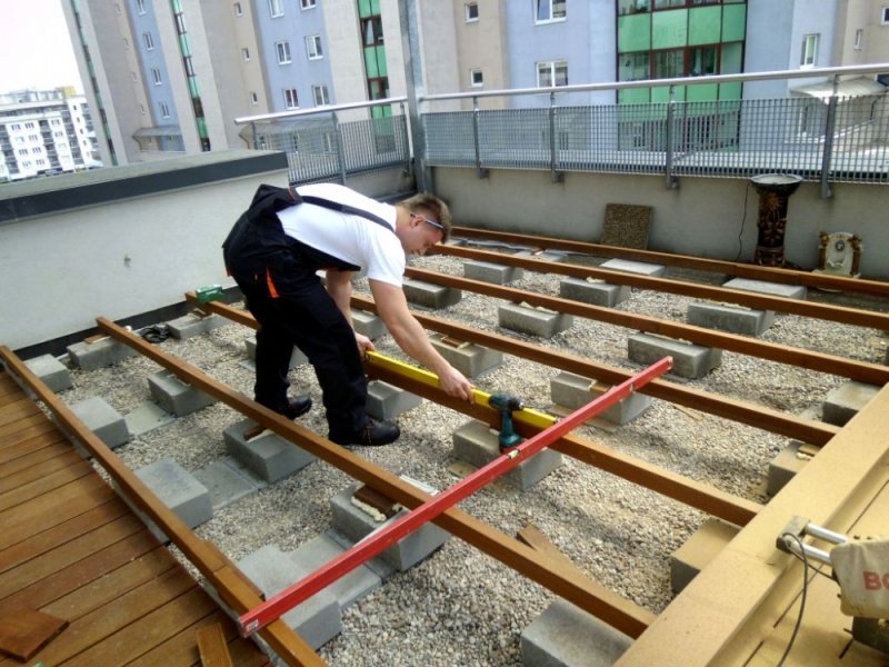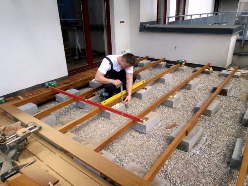 Aby cały taras był idealnie równy, niezbędne jest wypoziomowanie całej konstrukcji. Do podniesienia tarasu wykorzystujemy konstrukcje metalowe, lub jeśli konieczne jest nieznaczne podwyższenie poziomu wtedy korzystamy z bloczków betonowych. Do wypoziomowanej podstawy przykręcamy legary, tak aby cała konstrukcja była równa i stabilna.