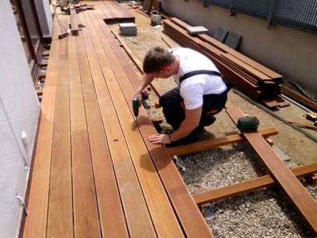 Deski przykręcamy do legarów za pomocą wkrętów firmy Spax. Przy każdym łączeniu deski z legarem wkręcamy 2 wkręty. Korzystamy jedynie z profesjonalnych wkrętów, dzięki temu mamy pewność że bez problemów przymocują deskę do legara, nawet z najtwardszych desek egzotycznych. Ciekawostką jest to że standardowe wkręty ze stali łamią się i wyginają przy wkręcaniu do tak twardych gatunków drewna egzotycznego jak bangkirai, cumaru czy tatajuba.