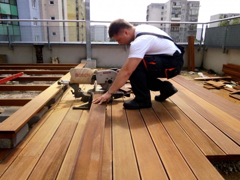 Aby cały taras wyglądał solidnie niezbędny jest profesjonalny sprzęt. Deski tarasowe przycinamy na specjalistycznej pile głębokościowej z listwą prowadzącą, aby ucinać deski równo pod kątem 90 stopni. Precyzyjne wykończenie wszystkich detali tarasu jest podstawą naszych prac. Zawsze staramy się aby powierzchnia tarasu była idealnie równo ułożona i aby cały taras był dobrze przycięty.
